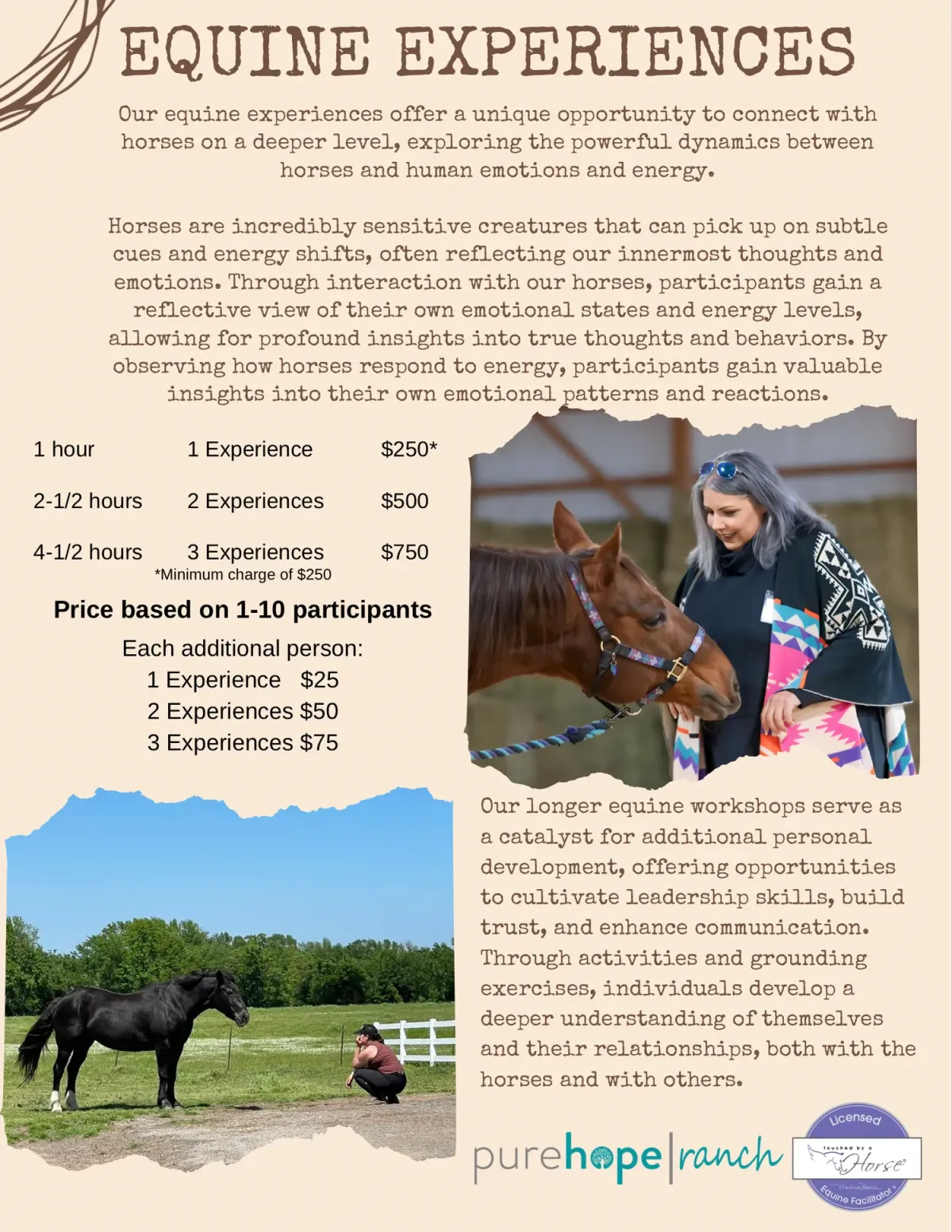 Don't miss the chance to enhance your Pure Hope Ranch experience with this extraordinary equine adventure. Whether you're seeking leadership insights, decision-making skills, or simply a deeper connection with the present moment, our equine companions are ready to guide you on a journey of self-discovery.